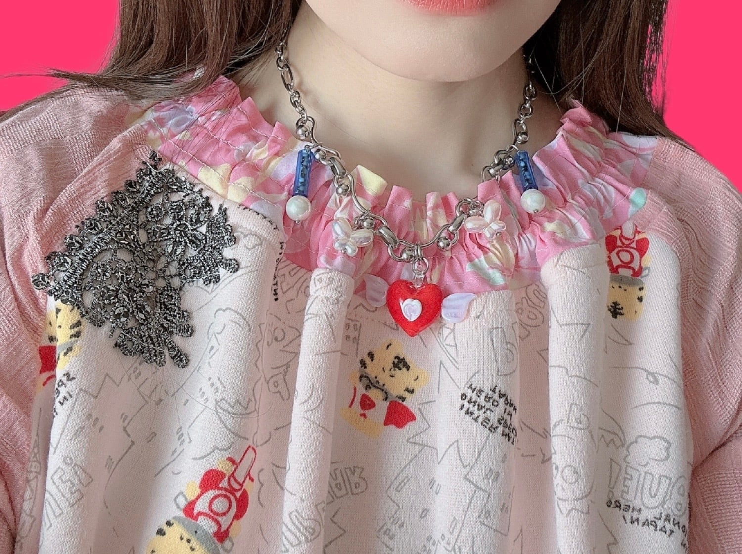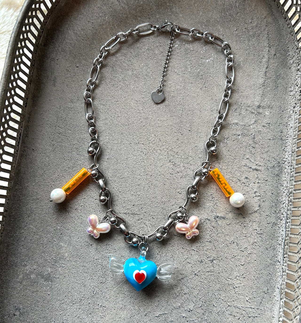 羽根のはえたガラスチャームをメインに、蝶々ビーズやヴィンテージビーズを合わせたネックレス。