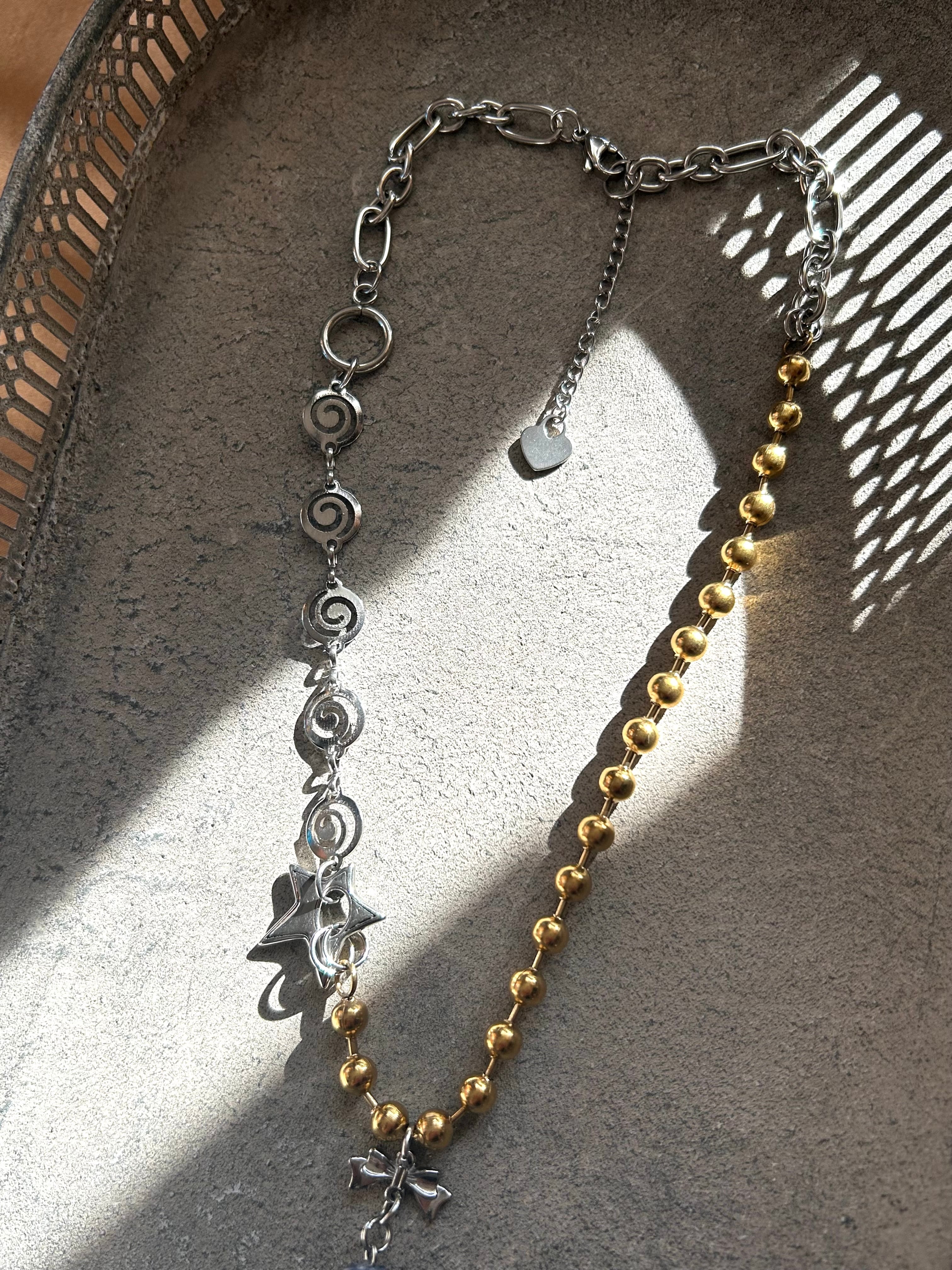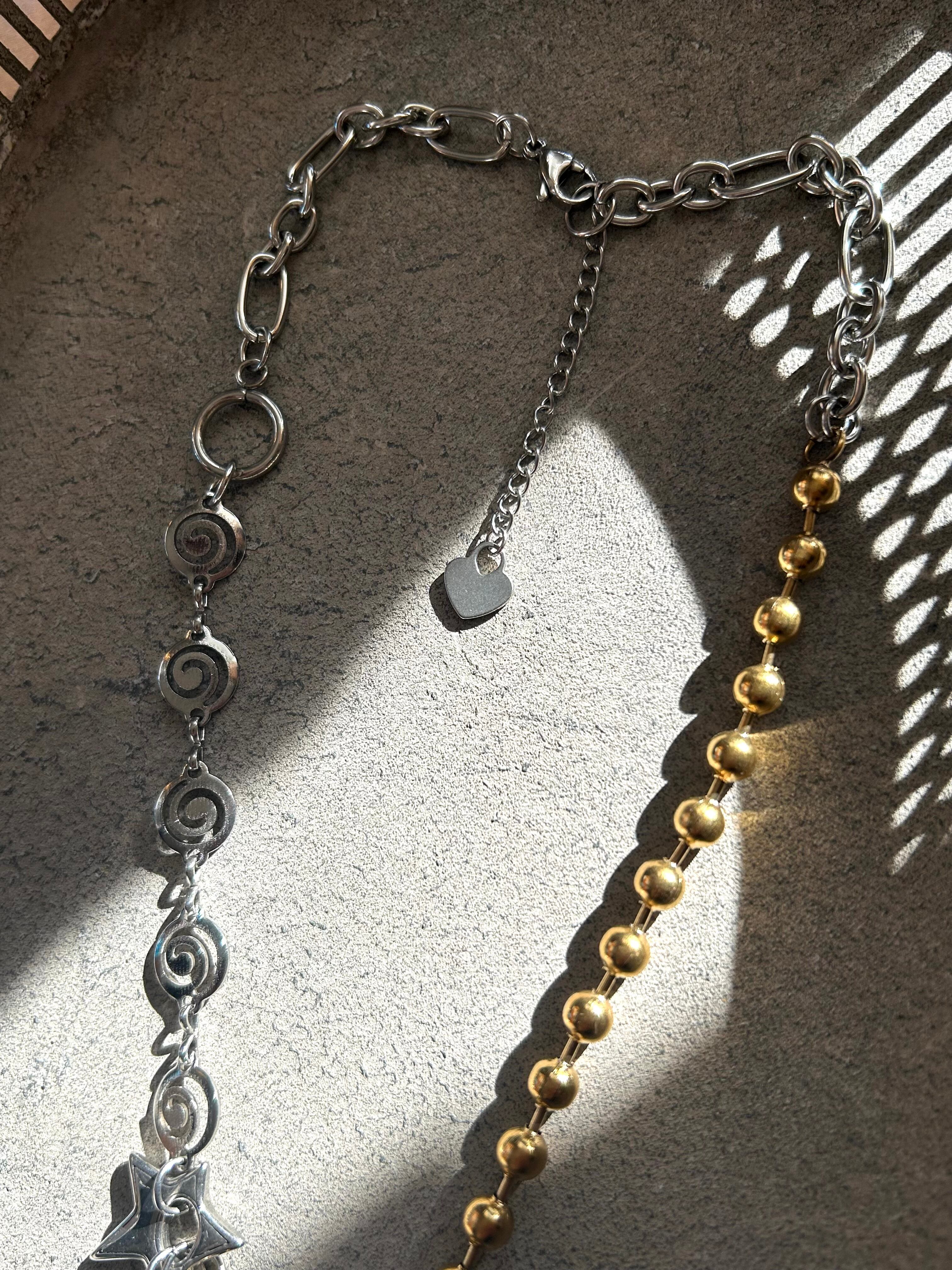 ゴールド×シルバーの様々なチェーンをミックスさせたネックレス。